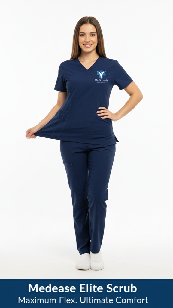 The Medease Luxe Scrubs are made from a premium stretch fabric blend that combines style, comfort, and performance. Designed for modern healthcare professionals, they provide superior flexibility, moisture management, and a tailored fit.